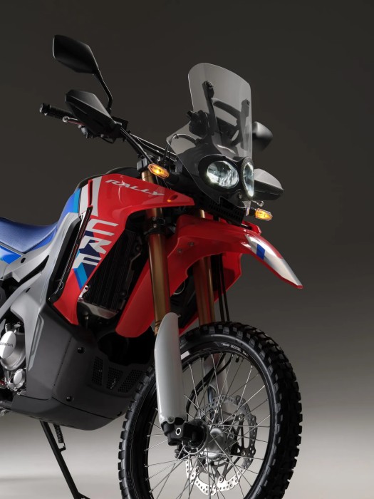 Designed to go the distance and look great doing it, the CRF300L Rally is now even better with updated suspension and enhanced heat management. Featuring a larger fuel tank, rally-style windscreen, and extended bodywork, this street-legal dual sport is ready for wherever the ride takes you. On the road or off.