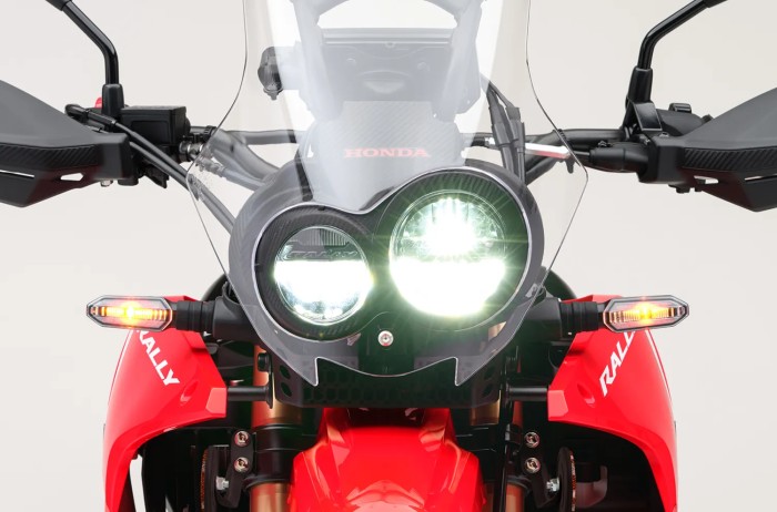 The CRF300L has rugged lightweight fairing and now features a new LED headlight and indicators, ensuring a big presence on the road day or night, improving visibility for the rider and other road users.