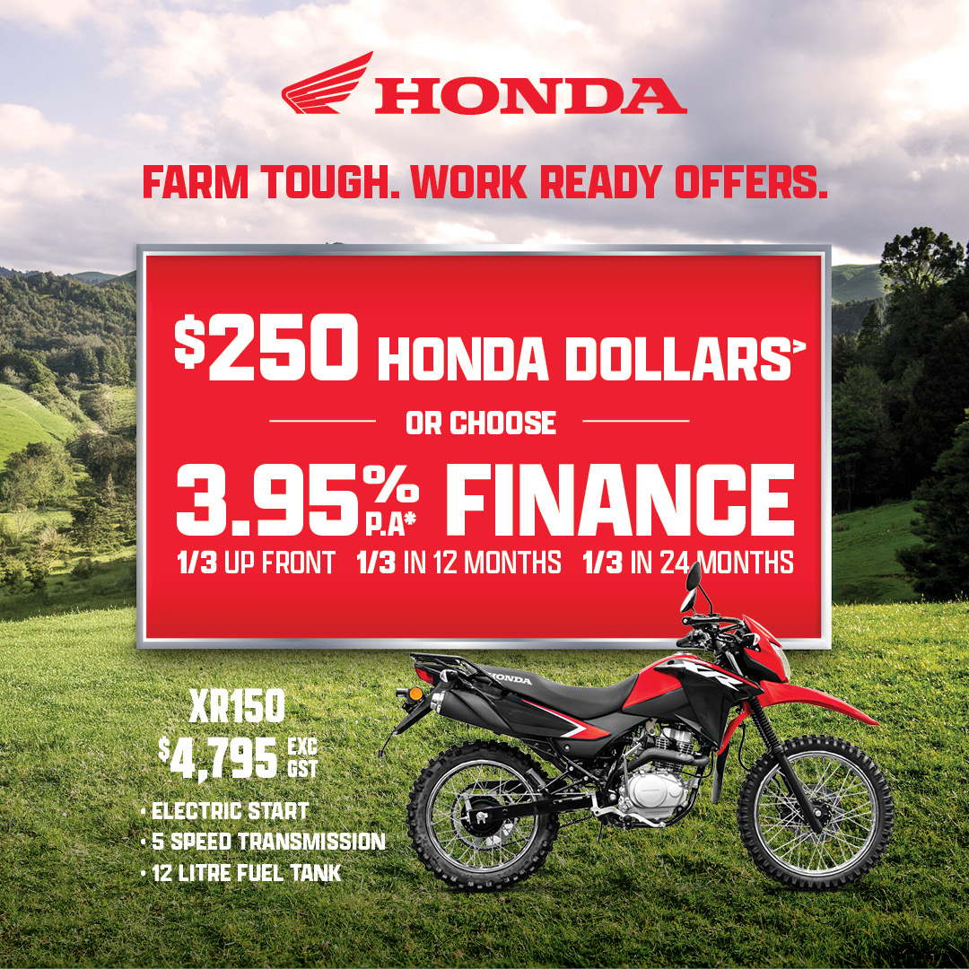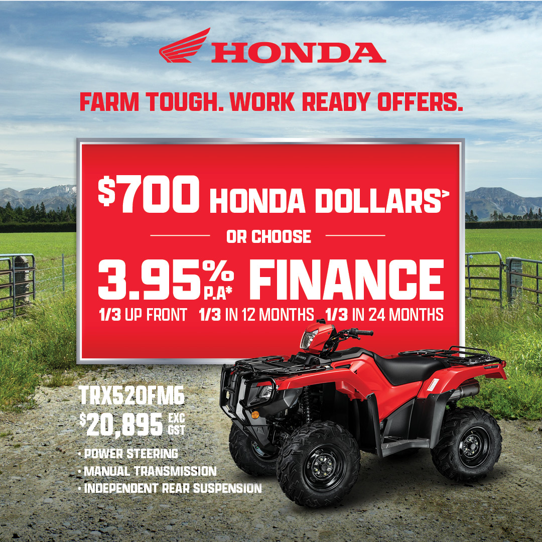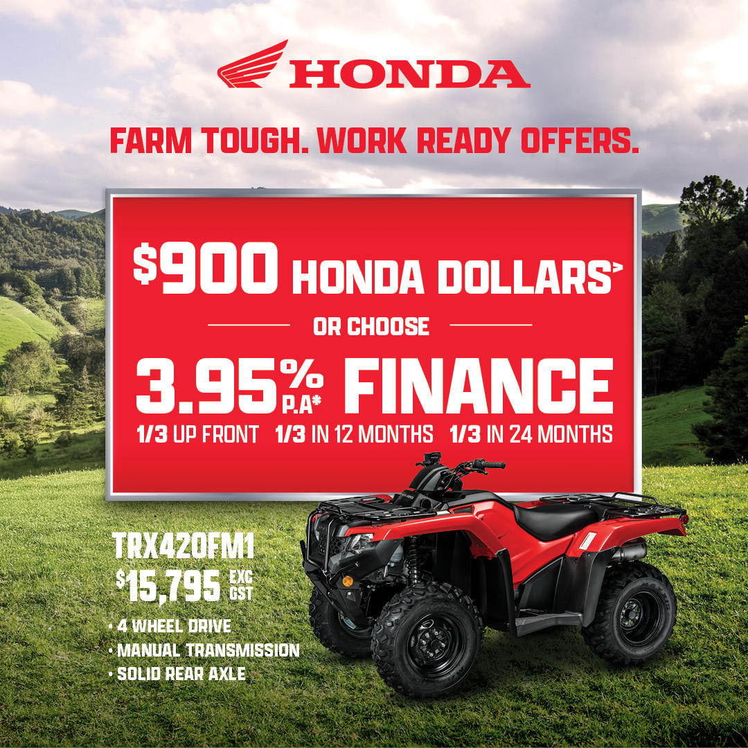 Get your next Honda farm workhorse sorted with an offer that works the way you do. For a limited time, when you purchase a selected new Honda ATV or 2 wheel farm bike, you can choose what suits your farm and your cashflow best.