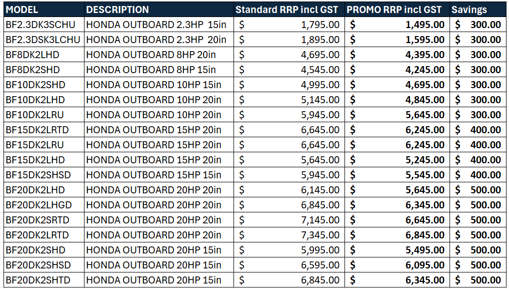 For a limited time, you can save up to $500 on selected 2.3hp–20hp Honda 4-stroke outboards. Whether you’re fishing the bays, exploring new waterways, or heading out for family fun, there’s a Honda outboard to get you there with confidence and efficiency.